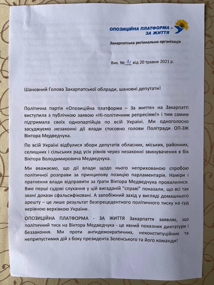 ОПОЗИЦІЙНА ПЛАТФОРМА - ЗА ЖИТТЯ Закарпаття заявляє, що політичний тиск на Віктора Медведчука - це явний показник диктатури і беззаконня. Ми проти антидемократичних, неконституційних та неприпустимих дій з боку президента Зеленського та його команди!