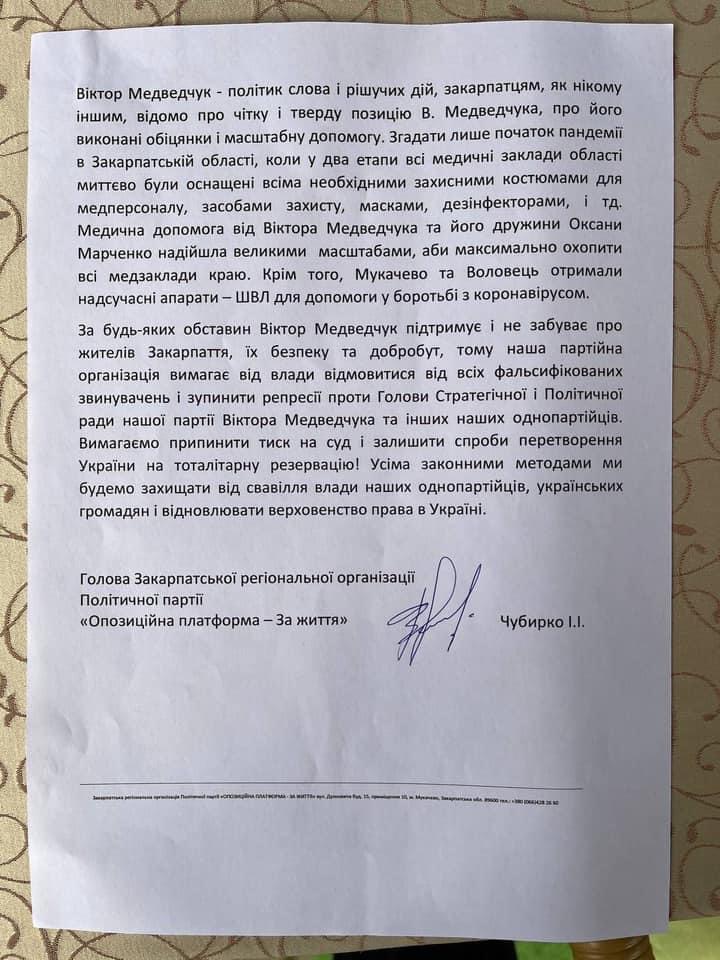 За будь-яких обставин Віктор Медведчук підтримує і не забуває про жителів Закарпаття, їх безпеку та добробут, тому наша партійна організація вимагає від влади відмовитися від всіх фальсифікованих звинувачень і зупинити репресії проти Голови Стратегічної і Політичної ради нашої партії Віктора Медведчука та інших наших однопартійців.
