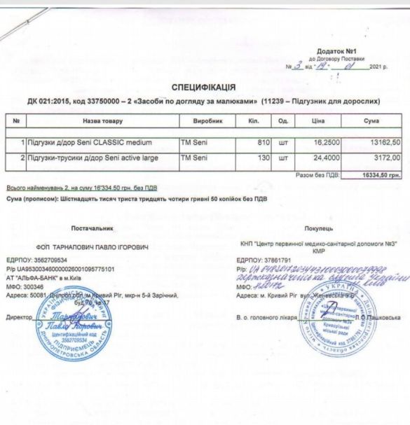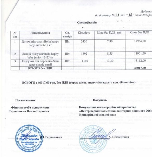 Так, наприклад, ЦПМСД№6 Криворізької міської ради уклав договір з ФОП Тарнапович Павло Ігорович (ФОП не має боргів перед податковою і в кримінальних справах не помічений) на закупівлю підгузків на суму 46 тисяч 17 гривень 60 коп.