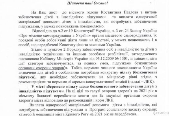 Жінка зазначає, що діти за медичними показаннями та відповідно до постанови "Про затвердження порядку забезпечення осіб з інвалідністю і дітей з інвалідністю технічними та іншими засобами" мають право на безкоштовне забезпечення підгузками. За 4 роки можливість самим закуповувати засоби гігієни у Кривому Розі показала себе на відмінно. Кожен з батьків міг сам обирати виробника підгузків, розмір, якість тощо. Цього ж року, стверджують батьки, у міськраді вирішили не давати кошти на підгузки на руки, а видавати самі засоби гігієни у центрах первинної медико-санітарної допомоги міста.